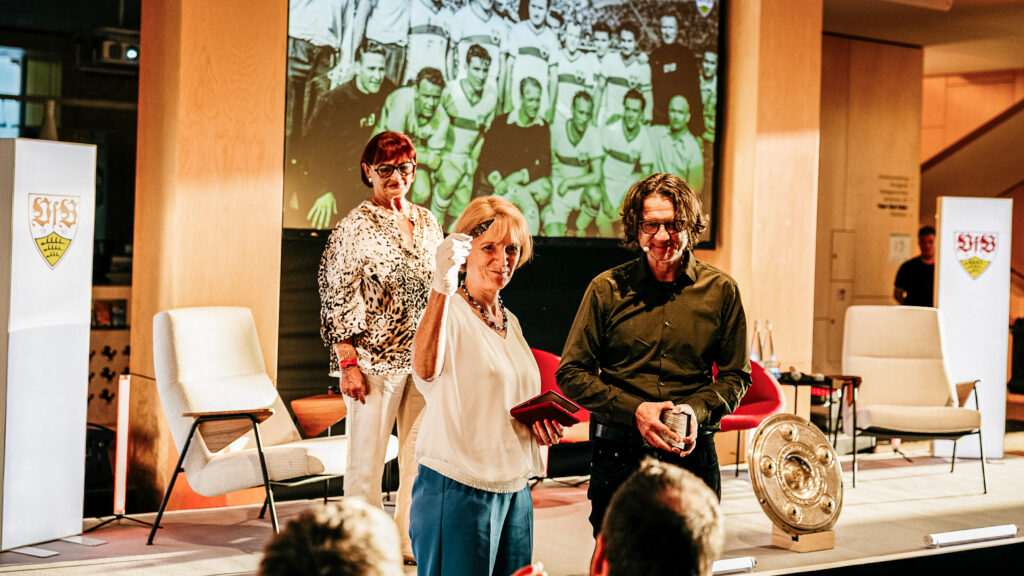 Moderation des historischen Abends im Stadtpalais. 75 Jahre erste Deutsche Meisterschaft des VfB Stuttgart. Podiumsgespräch über die Bedeutung der Meisterschaft für Stadt und Verein. Mit Christa Ströhle-Duchatsch, Dr. Gudrun Kruip und Peter Schmid