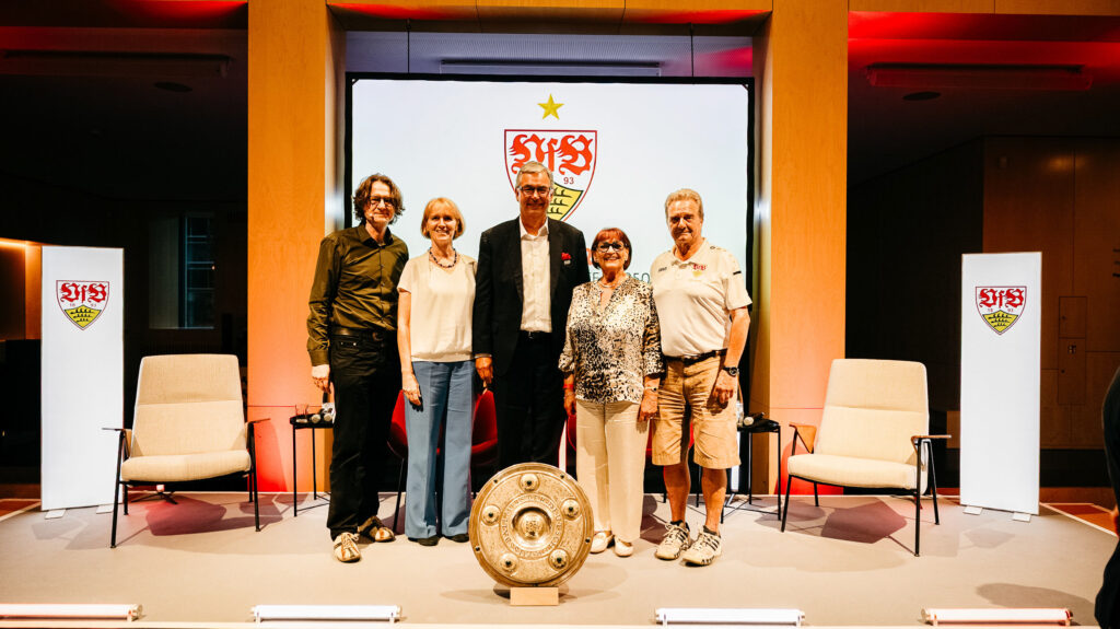 Zum Abschluss des Themenabends fand eine von Moderator Bernd Sautter geführte Podiumsdiskussion statt, an der neben Frau Dr. Gudrun Kruip von der Stiftung Bundespräsident-Theodor-Heuss-Haus auch Christa Ströhle-Duchatsch (Tochter von Meisterspieler Josef Ledl) und Peter Schmid (Sohn von Meistertorwart und -kapitän Otto „Gummi“ Schmid und Vorsitzender der VfB Garde) teilnahmen und spannende Anekdoten teilten. Frau Dr. Kruip präsentierte das seinerzeit von Bundespräsident Theodor Heuss an den VfB vergebene Lorbeerblatt und erläuterte: „Dieses Silberne Lorbeerblatt war das erste, das jemals verliehen worden ist und es ist bisher das einzige, das für den Gewinner einer Deutschen Meisterschaft im Fußball. Wir freuen uns sehr, dass wir das Silberne Lorbeerblatt mit seiner spannenden und emotionalen Geschichte bei uns im Theodor-Heuss-Haus zeigen können.“