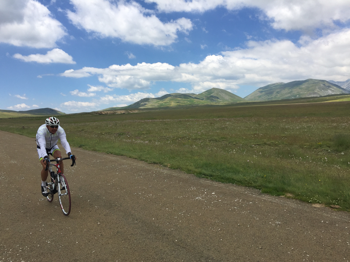 Einmal Mond und zurück. Ich kann mich an keinen Tag auf dem Rad erinnern, der so eindrucksvoll war, wie der gestrige. Zurück von L’Aquila durch die Abruzzen über den Campo Imperatore nach Chieti. Das hatte im Profil gar nicht so schwer ausgesehen. Waren aber laut Garmin runde 2500 Höhenmeter. Aber sehr gerne. Die Strecke war der ideale Campo für mich, den Imperatore unter den Jungbergziegen. Vom ehemaligen Gletscher ist eine riesige Hochebene übrig, die ich gegen böhigen Wind auf gerader Rumpelpiste durchschneide. Ich, Rouleur Imperatore. Schon der Aufstieg war wunderschön. Zwischen den Steinen blühen die Kräuter. Hoch geht’s so langsam, dass ich die Pflanzen am Wegesrand bestimmen könnte, hätt ich nur einen Pflanzenführer zur Hand. Oben steht ein Schild, in Memoriam Pantani. Wie schnell der den Pass hochsprintete, will ich eigentlich gar nicht wissen. Hinter der Passhöhe geht’s runter zum Mond. Hinterm Mond geht’s dankenswerterweise noch weiter, meistens runter, jedoch mit schmerzhaften Gegenhängen, damit die Beine schön wehtun. Wunderbare Dörfer durchquere ich der Abfahrt. Caffebar Pflicht. Bei der Schussfahrt mit Aussicht trotz Staunen Mund geschlossen halten. Das habe ich gelernt, sonst droht ungebetene Mahlzeit. Was ich heute lerne, praktisch Erkenntnis des Tages: Statt Aussicht schön auf die Schlaglöcher achten. Sie sind immer immer immer dort, wo man sie nicht sieht, im Schatten unter den Bäumen. Tut man’s nicht, macht’s plötzlich Pffft. Nur ein kurzes Pfft. Und dann ist die Luft raus und der Achter drin. Langsam, ganz langsam nähere ich mich nach Schlauchwechsel am Abend Chieti und schwöre mir, dass ich bei der Planung in Zukunft keine Städte auf Bergrücken mehr ansteuere. Da macht selbst die Junior-Bergziege nur noch müde „Mäh“.