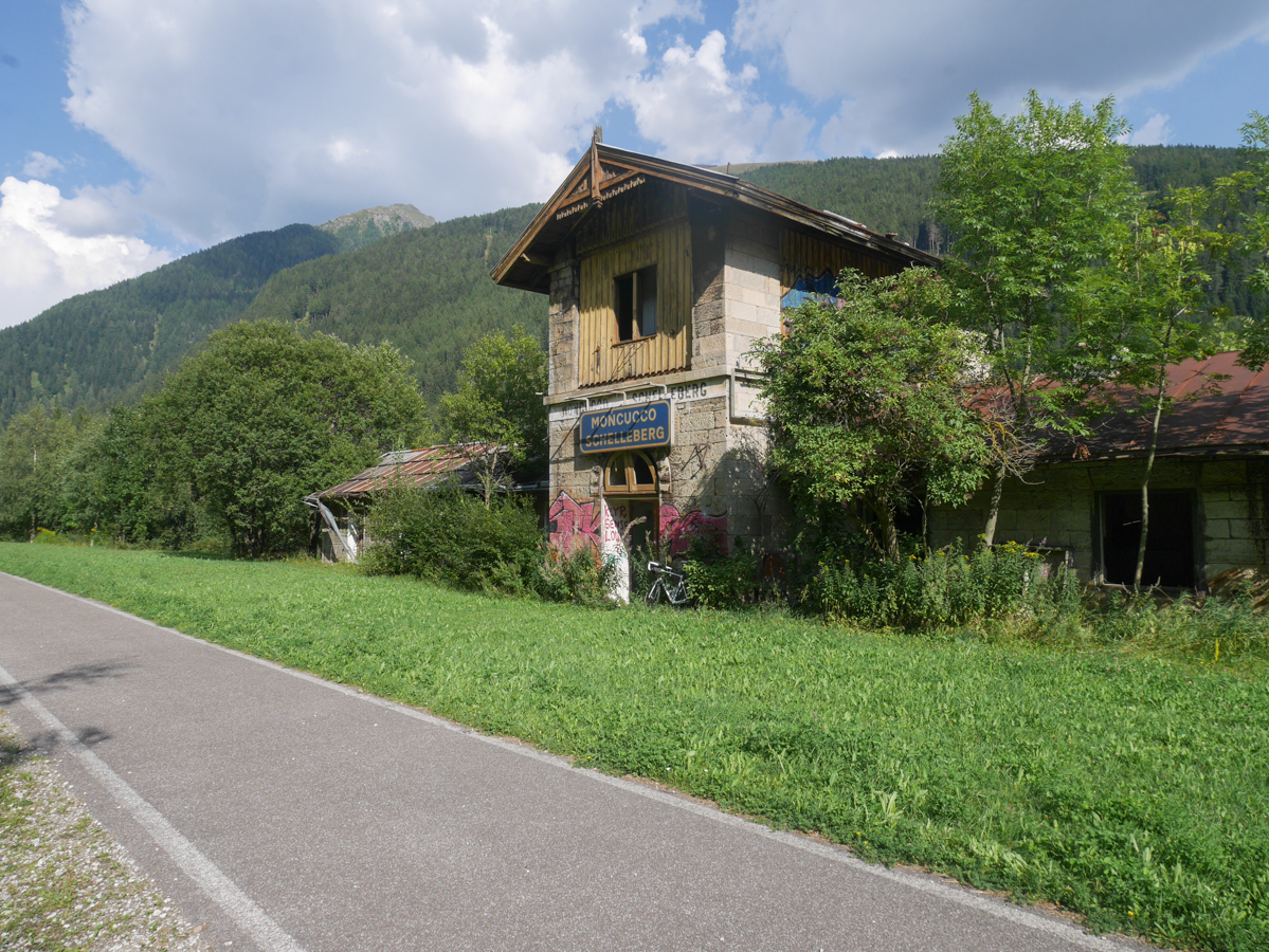Jetzt geht das schon wieder los. Am Brenner hängt aus den Baracken die Wäsche quer über den Radweg. Ohne Brille sehen die vielen Shirts aus wie das Startbanner einer Grantour. Bißchen wenig Publikum. Hab mich mit der Bahn an diesen verwunschenen Ort bringen lassen. Weil: Hier fängt Italien an – und es geht erstmal runter. Wie gut geht’s mir eigentlich? Bayern und Österreich wollen hier Hilfesuchende abfangen. Und ich kann aussteigen und in die andere Richtung runter. Aber die Hilfesuchenden schaffen es gar nicht bis zum Brenner. Drum ist nichts los gegen Vier. Outlet und Caffebar as usual. Keine Skandale. Brenner dicht machen – kack Populisten. Da lache ich selbst über mein Wohlstandsproblemchen. Bin zwei Stunden zu spät dran. Sänk ju for drawelling wis Deitsche Bahn. Jetzt muss ich treten, sonst wird’s dunkel, bevor ich im Etappenziel Bruneck ankomme. Aber den verfallenen Bahnhof an der alten Trasse, die jetzt ein feiner Radweg ist, muss ich erkunden. Abenteuerspielplatz für Schwaben. Die Ruine strahlt in bestem Licht. Klar, weil die Sonne schon von der Seite kommt… unter einer dicken Wolke durch. Wolke? Dicke Wolke?? Also nix wie weg hier. Außer ein paar Tropfen werde ich verschont. Nachdem ich die Wetter-App für morgen gecheckt habe, hab ich die App gelöscht.
