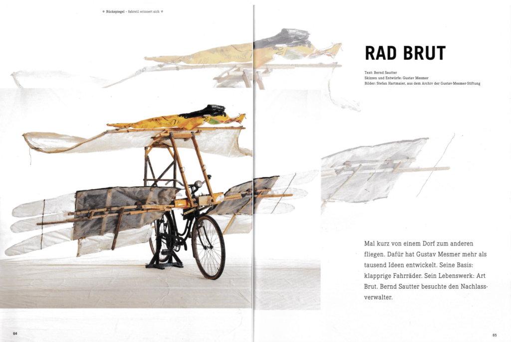 Mal kurz von einem Dorf zum anderen fliegen. Dafür hat Gustav Mesmer mehr als tausend Ideen entwickelt. Seine Basis: klapprige Fahrräder. Sein Lebenswerk: Art Brut. Mein Beitrag für das fahrstil Magazin #36 Kunst.