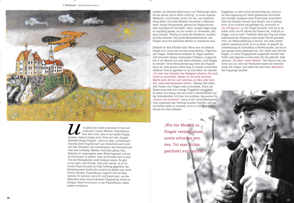 Deshalb ist dem Erfinder klar: Wenn man als Mensch fliegen will, muss man es eben ausprobieren. Vögel können fliegen. Fledermäuse schaffen es. Sogar Insekten. Alle brauchen keinen technischen Firlefanz. Ausgerechnet er als Mensch soll sich damit abfinden, nicht fliegen zu können? Diese Herausforderung treibt den Flugradbauer an. Sein ganzes Leben lang. In seinem unverwechselbaren Duktus appelliert er an sich selbst. Er schreibt: “Du hast vom Schöpfer die Fähigkeit erhalten, für dich selbst zu erschaffen. Mache dir die Erde untertan. Mache auch dir die Luft untertan, es wäre jetzt bald Zeit, nach abertausenden Jahren.“ Mesmer lebt dafür, dem Traum vom Fliegen nahe zu kommen. Schon am Boden muss man das richtige Fluggefühl entwickeln. Es schert ihn wenig, was die Leute in Buttenhausen auf der Schwäbischen Alb über ihn erzählen. Sie nennen ihn „Ikarus vom Lautertal“, wenn er mit seinen abenteuerlichen Apparaten den Feldweg hinunter brettert, nur um ein Gefühl dafür zu erhalten, ob es so vielleicht klappen könnte mit dem Abheben.