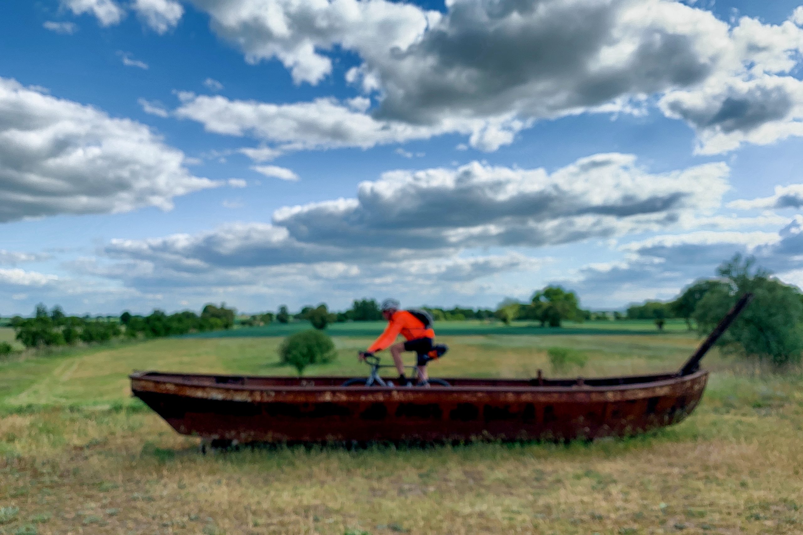 Nach runden 120 Kilometern waren wir ganz schön im Eimer. Blöd nur, dass noch weitere 50 auf dem Routenplan standen. Aber heute nichts zu meckern. Super Etappe. Super Rückenwind. Super Oder! Und immer wenn wir im Eimer waren und eigentlich eine einladende Gastwirtschaft gebraucht hätten, dann kam auch eine. Der Michl den Majtes mit Bratkartoffeln und das Mars zum Nachtisch förmlich inhaliert. Der Fisch ist fast am Stück runtergeflutscht. Essen wichtig, sagt der Michl. Dann weiter an der Oder entlang. Weiter und weiter. Bestes Licht am Abend: Gerichtet wie ein Spot, und trotzdem mild und temperiert. Was für ein Licht! Hatte ursprünglich gedacht, diese Oderentlanggurkerei wäre langweilig. Nö. Am östlichen Arsch von Deutschland könntest du 60 Kilometer lang pausenlos in alle Richtungen fotografieren, so schön ist das. Zugegeben, alle sechstausend Fotos würden sich ähnlich sehen. Alle so mit Bilderbuchwolken, sattem Grün und kitschigem Vordergrund. Wurscht. Der Oderkenner schätzt das malerische Detail. Selbst wenn jedes Foto aussieht, wie es kein naiver Künstler mit Harmonieanfall hinbekommen hätte: Egal. Meinen Fotokurs für Anfänger würde ich an der Oder geben. Idiotensicheres Revier. Klare Ansätze von Paradies. Storch und Reh und wir in Lycra.