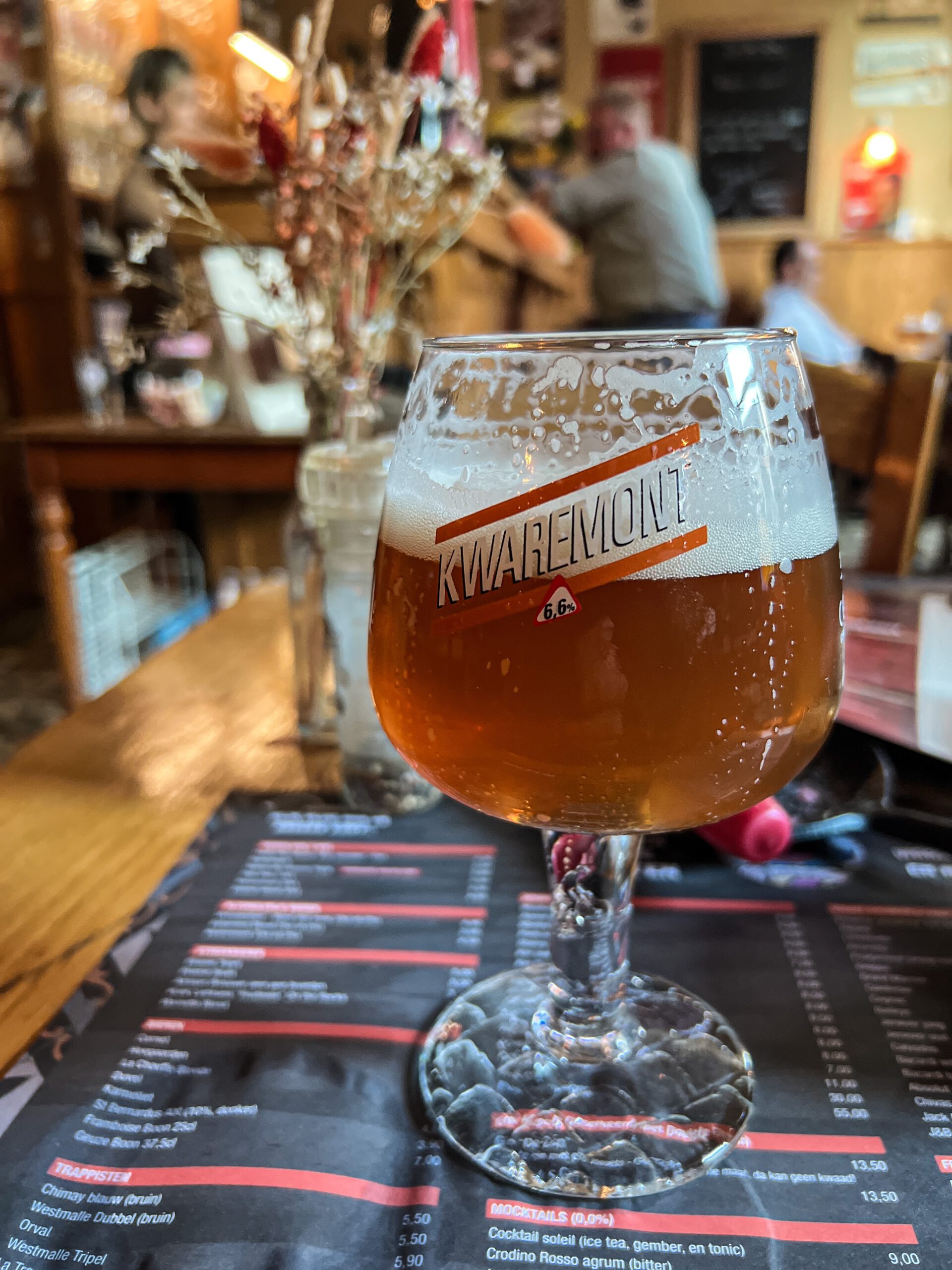 Ein Bier tut der Form keinen Abbruch. Belgische Biere gehören zum immateriellen Weltkulturerbe der UNESCO. Lokale Biere werden bevorzugt, selbst dann, wenn sie ein paar Kilometer in der Nachbarschaft hergestellt werden. Bei uns in Deutschland darf nur Wasser, Hopfen, Malz und Hefe drin sein. Nennt sich Reinheitsgebot. Belgien wundert sich vermutlich seit mehr als hundert Jahren über das deutsche Gebot, das definitiv aus der Zeit gefallen ist. Inzwischen längst Kreativbremse. Jetzt will ich nicht so tun als wär ich Biersommelier oder wäre mein Geschmack feiner als der eines durchschnittlichen Quartalsäufers (m/w/x). Aber ich stelle fest: Hier macht‘s Bier mehr Spaß als zuhause – und das liegt nicht nur am Urlaub. Sondern auch an der Tradition. Ob es nach Himbeer oder Kirsche schmecken muss, sollen Andere beurteilen. Ist für jeden was dabei. Und für mich heute ein Kwaremont. Ich tippe diese Zeilen im zünftigen Eetcafé „In de Zon“, das mit Café so viel zu tun hat, wie das Oktoberfest mit gutem Geschmack. Die Gaststube proppenvoll. Wenn einer stört, bin‘s ich. Handytippend. Aber ich darf das, ausnahmsweise. Denn die Gaststube liegt oben am Kwaremont. Und den hab ich bezwungen. Flandrien! Der kleine Weiler heißt wie der Berg, wie das Bier, das hier seinen Ursprung hat, und wie der klassische Aufstieg bei der Flandern-Rundfahrt, der Oude Kwaremont, der keine dreißig Meter von meinem Bier endet.